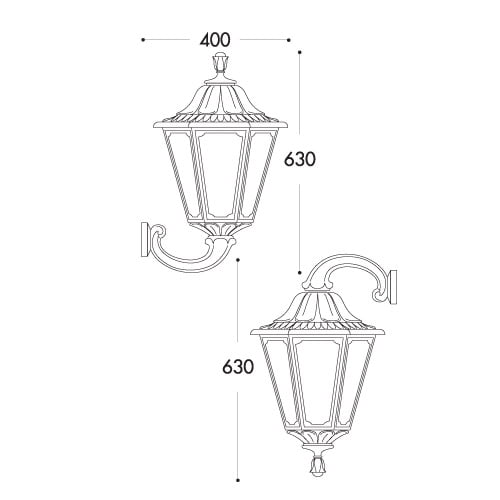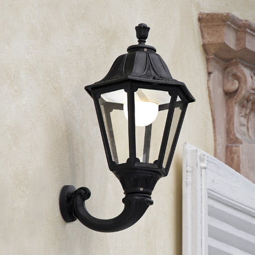 Hexagonal lantern made in shockproof resin material, UV rays stabilized, rust and corrosion-free. Modular construction suitable for post top, wall and hanging installation. Provided with reflective ceiling designed to host the lighting source and equipped with TÜV-CB certified, long-life and efficient E27 high power LED lamp included. Insulation class II, Protection rating IP55.